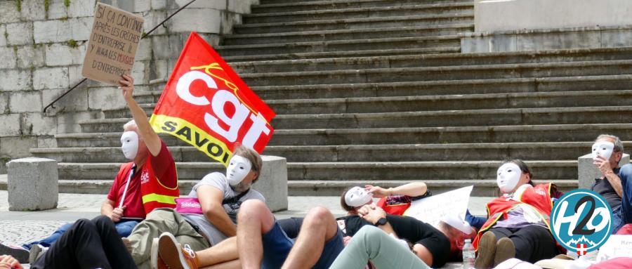 “Après les crèches d’entreprises, il y aura les morgues d’entreprises”. Les pancartes sont rares ce mardi 23 mai au pied de l'escalier du Château de Chambéry. La cinquantaine de manifestants s’habillent de masques blancs et s’allongent sur le béton, sous l'étouffant soleil du début d’après-midi. Tous réclament une revalorisation salariale des professionnels du social et du médico-social. Il y a seulement un petit quart d’heure, une partie d’entre eux a été reçue dans les bureaux de la préfecture. Éric Sorbets, éducateur spécialisé, en faisait partie. Il nous raconte l’entrevue : “On est allé rencontrer pour la 6e fois en deux ans et demi les responsables de la Savoie, de la préfecture et de l'ARS pour reparler de la situation dégradée de notre secteur. Et pour revendiquer une augmentation des salaires”.