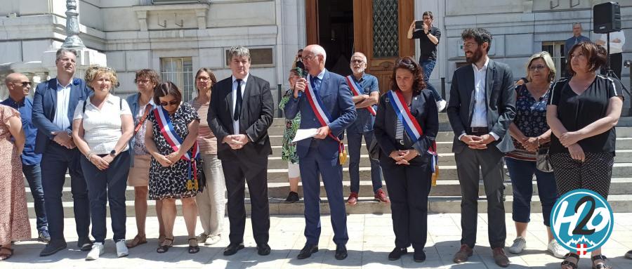 Thierry Repentin, maire de Chambéry, et François Ravier, préfet de la Savoie, ont affiché leurs soutiens aux maires victimes des violences de ces derniers jours. À l'initiative de l'Association des maires de France, ils se sont rassemblés ce lundi 3 juillet devant l'Hôtel de Ville de Chambéry.