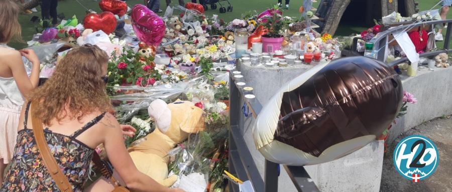 Si des enfants jouent sur l’aire, personne ne peut ignorer les fleurs, les bougies, les peluches et les ballons déposés. Trois jours après l’attaque au couteau qui a fait six victimes, dont quatre enfants en bas-âge, Annéciens et Annéciennes continuent de venir et d’apporter comme ils peuvent leur soutien.