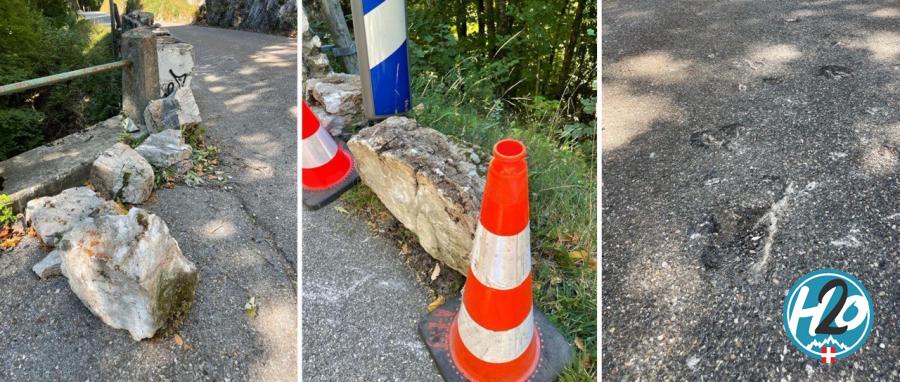 L'axe vient d'être le théâtre d'une chute d'un rocher dont le point est estimé à +/- 500 kilos environ 2 kilomètres avant le col de la Forclaz, côté Talloires. Par chance, aucun usager n'a été blessé par cette chute.